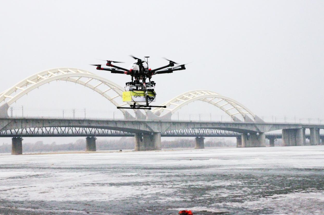 大連中??萍及l展有限公司歷時一年研發的IGPR-30無人機飛航測冰雷達,2016年初在松花江哈爾濱江段試驗成功,獲得了清晰準確的連續冰層雷達圖像。飛航測冰現場,系統飛行姿態穩定,雷達探測成像清晰,操控靈敏,可以10-15m/s速度快速連續施測,可實時獲取高精度的河流冰層連續厚度數據。IGPR-30無人機飛航測冰雷達集成了RTK精確定位系統,可準確測量記錄飛航測線軌跡,并與GIS地圖融合。IGPR-30無人機飛航測冰雷達是河流冰情觀測的創新性技術設備,為河流冰情快速精準測量和河流凌汛應急探測提供了先進的高效率的技術手段。